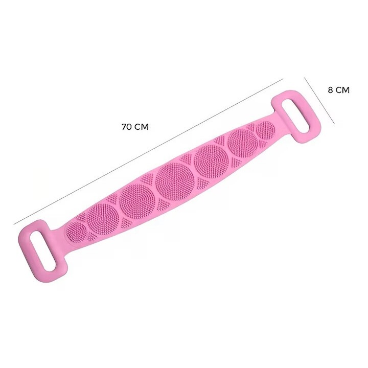 Perie de corp tip banda 2in1 pentru baie, din silicon pentru curatare, exfoliere si masaj corporal, roz 70 cm